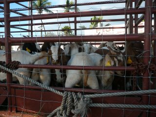 Boer goats are larger and meatier than their run-of-the-mill cousins, and this project is a big deal, not just for Joe and Julie (who, in their seventies, might supposed to be retiring!!!), but for Fiji agriculture in general. Joe had a big press kit prepared and the relevant ministers of the Fiji government were all over it. Unfortunately, it was impractical for us all to troop down to the airport to see the goats' actual arrival, but we did all cab to the Lautoka Wharf Thursday to see them transhipped by truck to the Westerland ferry for an overnight ride to Savusavu and thence over the mountains to their new home at Palmlea. They looked hot, tired, uncertain and...well...like goats. Joe and Julie and the Fijian government have an ambitious breeding plan planned. Ravine is proud as punch.