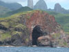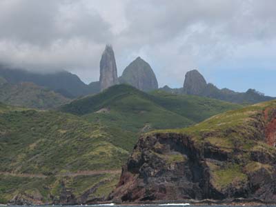 | 2C Update #111 To make the twelve-hour sail from the Southern Marquesas to Ua Pou, the closest island in the northern Marquesas, the Two Captains raised Tackless's anchor just after midnight . The early hours of the trip, still in the lee of Hiva Oa , were windless, so we were forced to motor. By four a.m. , however, our wind began to fill and we enjoyed yet another fine sail with the wind on the beam. Couple the smooth ride with a stunning sunrise and we were in a much uplifted mood as we approached the island of Ua Pou. On the chart, Ua Pou looks like an Indian spear head made from a flake of stone, but in person the island thrusts skyward monoliths of countless volcanic plugs, the highest of which is over 4,000'! Through these the clouds shift, revealing and covering the spires mysteriously. It is quite the skyline.